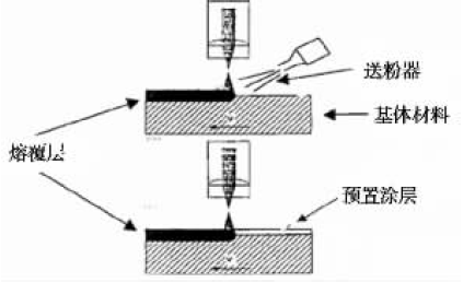 為了防止在高速、高溫、高壓、重載、腐蝕介質(zhì)等環(huán)境下工作的零件不因便面的局部損壞而報廢,提高零件的可靠性,延長使用壽命,世界各國都在研究和應(yīng)用各種提高零件表面性能的表面工程技術(shù)。傳統(tǒng)的表面改性技術(shù),如各種噴涂層。鍍層等,由于較差的層間結(jié)合力以及受平衡溶解度小,及固態(tài)擴散性差的限制,應(yīng)用效果并不理想。大功率激光器和寬帶掃描裝置的出現(xiàn),為材料表面改性提供了一種新的有效手段。在各類激光束處理中,激光熔覆是經(jīng)濟效益較高的一種新的涂層表面改性技術(shù),它可以在廉價基材上制備出高性能貴重的熔覆層表面,以降低材料成本,節(jié)約貴重稀有的金屬材料,降低能量消耗,提高金屬零件的使用壽命。激光熔覆裝置如圖所示,其中上圖所示的是同步送粉法,下圖為預(yù)置涂層法。