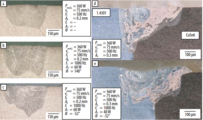 具有空間和時(shí)間功率調(diào)制(c)的焊縫,在不同材料組合中的焊縫傾斜補(bǔ)償(d,e)