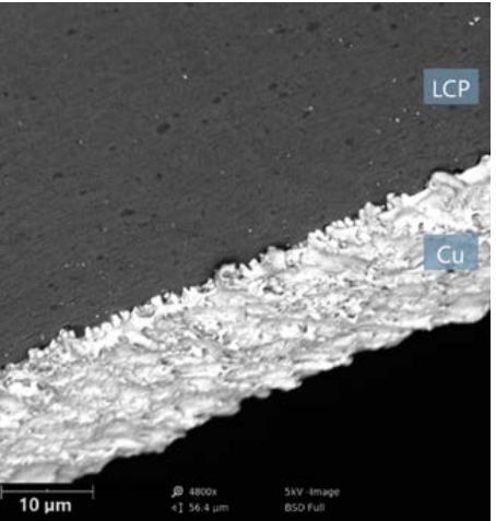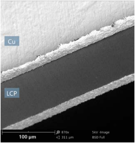 特別值得注意的是LCP切割邊緣的光滑度和垂直度,沒有明顯的“桶裝”或從銅鋪管機的切割邊緣拉回。高度放大的界面SEM視圖如圖4所示,并確認LCP和Cu層之間的結(jié)合得到了很好的保留。更詳細的細節(jié)還顯示了光滑平坦的LCP表面,沒有任何從切割銅邊緣拉回的痕跡。
