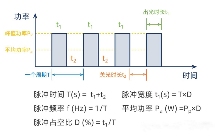 通常,我們在激光工藝調(diào)試中,對激光進(jìn)行調(diào)制時(shí),會設(shè)定峰值功率、脈沖頻率與占空比。接下來,我們用一個(gè)實(shí)例來說明如何計(jì)算PWM的各項(xiàng)參數(shù)。