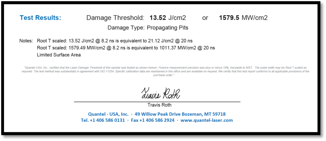 圖7 HR-355nm激光損傷測(cè)試結(jié)果(Tested By USA Quantel-Laser)