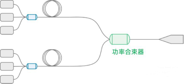 (2)功率合束器就是將多路單模激光合束到一根光纖中輸出,用來提高激光的輸出功率。
