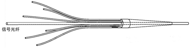 (N+1)×1合束器均為泵浦合束器,主要用于光纖放大系統(tǒng)中。該合束器中間的單模光纖為信號(hào)光纖,用于信號(hào)光的傳輸,環(huán)繞在其周圍的 N 路多模光纖為泵浦光纖,用于泵浦光的傳輸。這種合束器通常用于MOPA結(jié)構(gòu)。
