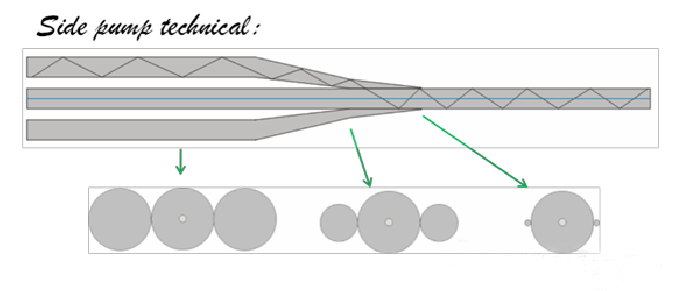 側(cè)泵合束器與端泵合束器不同的是,側(cè)泵合束器的泵浦光纖被拉細(xì)后貼合到信號(hào)光纖的包層上,而信號(hào)光纖并未熔拉變細(xì)。因此側(cè)泵合束器信號(hào)傳輸從原理上要優(yōu)于端泵合束器。