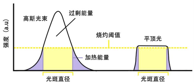 與高斯激光束相比,平頂激光束能更有效地利用能量。在高斯光束輪廓中,中間高于應用要求的強度閾值的過剩能量和兩翼中低于閾值要求的能量,都被浪費掉了。平頂光束輪廓中沒有兩翼,但具有較陡的邊緣過渡,因此能量利用效率更高,并且對周圍區(qū)域的損傷也會減少。