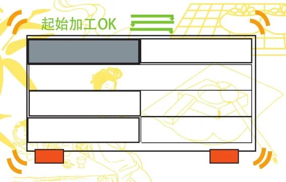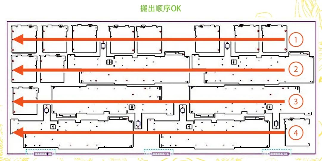 生產(chǎn)過程中,有時會使用TK機(jī)械手輔助取出切割完成的制品,這樣能更好地節(jié)約人力物力,實現(xiàn)設(shè)備的全自動化生產(chǎn)。但是在使用TK機(jī)械手取出制品時需要注意,要控制好制品的取出順序,避免板材因強(qiáng)度減弱、材料晃動產(chǎn)生切割波紋。如果先選擇將板材兩端制品取出,再將板材中間的制品取出,這樣就會造成板材兩端的應(yīng)力被釋放,板材強(qiáng)度不足,當(dāng)加工程序進(jìn)行到板材中間位置時,板材勢必會因強(qiáng)度不足而產(chǎn)生晃動,造成制品的切割波紋,如圖9所示,且產(chǎn)品不良率較高,加工損失較大。如果從遠(yuǎn)離夾鉗一側(cè)將制品依次取出,這樣可以很好地保證加工位置板材應(yīng)力集中,運(yùn)動穩(wěn)定,避免產(chǎn)生切割波紋,如圖10所示。因此在加工編程時,要保證被取出的制品從遠(yuǎn)離夾鉗一端依次進(jìn)行,這樣可以很好地保證板材強(qiáng)度,避免板材在運(yùn)動過程中因強(qiáng)度不足而產(chǎn)生晃動,從而避免切割波紋的產(chǎn)生。