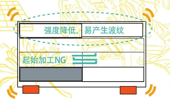 采用復(fù)合機(jī)進(jìn)行鈑金激光切割下料時,機(jī)床夾鉗夾持板材沿X方向和Y方向移動,制品加工設(shè)備及加工區(qū)域如圖1所示。但隨著加工的不斷進(jìn)行,板材局部應(yīng)力被釋放,強(qiáng)度逐漸減弱,導(dǎo)致板材在運(yùn)動過程中產(chǎn)生晃動,從而產(chǎn)生激光切割波紋,造成加工制品不良。而切割波紋的大小還與制品的加工方向、初始加工位置、制品取出順序等因素有關(guān),不同情況的切割波紋不良現(xiàn)象如圖2、圖3所示。且大尺寸制品由于從板材上切割開后,板材的應(yīng)力釋放會較大,因此在切割板材剩余部分時,板材隨夾鉗移動,晃動就會更大,造成切割剩余制品時產(chǎn)生切割波紋。由于產(chǎn)品尺寸較大、加工時間較長,因此造成加工費(fèi)用及材料浪費(fèi)較多,所以盡可能保證板材在切割運(yùn)動過程中的受力穩(wěn)定及受力強(qiáng)度是切割下料過程中需要重點考慮的問題。
