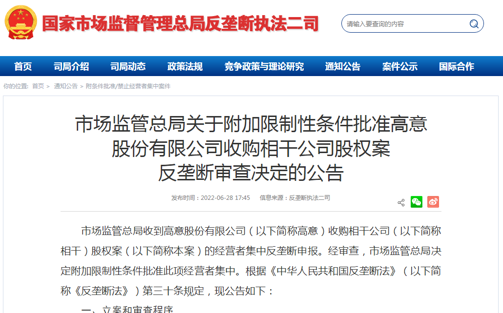 6月28日,國家市場監(jiān)管總局(以下簡稱“市監(jiān)總局”)發(fā)布公告,附加限制性條件批準(zhǔn)高意股份有限公司(以下簡稱“美國高意”)收購相干公司。這是2022年以來,市監(jiān)總局批準(zhǔn)的第三宗國際并購案。
