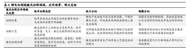 熱影響控制仍是難點,紫外激光存在替代傳統(tǒng)模切可能。根據(jù)存能電氣官網(wǎng)信 息,鋰離子電池隔膜 PP 膜與 PE 膜兩者的熔點不同,PE 隔膜在 130℃左右,PP 隔膜 在 160℃左右。根據(jù)英諾激光招股說明書,在薄膜非金屬材料加工等領(lǐng)域,高能量 的紫外光子直接破壞非金屬材料表面的分子鍵,使分子脫離物體,這種方式不會產(chǎn) 生高熱量反應(yīng),因此通常被稱為“冷加工”,紫外激光機在微加工領(lǐng)域具有不可替代 的優(yōu)勢。我們判斷,在目前仍是模切為主的隔膜切割環(huán)節(jié),由于隔膜較低的熔點導(dǎo) 致激光切割熱影響控制仍是難點,紫外激光以“冷加工”的優(yōu)勢存在替代傳統(tǒng)模切可 能。
