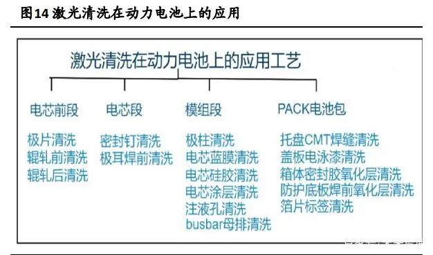 電池焊接前:根據(jù) C114 通信網(wǎng)官網(wǎng)信息,采用脈沖激光直接輻射去污,使其 表面溫度升高而發(fā)生熱膨脹,熱膨脹使污染物或者基底振動,從而使污染物克服表 面吸附力脫離基底表面從而達到去除物體表面污漬的目的。這種方式可以有效地去 除電芯極柱端面的污物、粉塵等,為電池焊接提前做準(zhǔn)備,以減少焊接的不良品。電池組裝過程中:根據(jù) C114 通信網(wǎng)官網(wǎng)信息,為了防止鋰電池發(fā)生安全事故,一般需要對鋰電池電芯進行外貼膠處理,以起到絕緣的作用,防止短路的發(fā)生 以及保護線路、防止刮傷。對絕緣板、端板進行激光清洗,清潔電芯表面臟污,粗 化電芯表面,提高貼膠或涂膠的附著力,且清洗后不會產(chǎn)生有害污染物,屬于環(huán)保 的綠色清洗方法,這在全球高度關(guān)注環(huán)保的情況下越發(fā)顯出它的重要性。