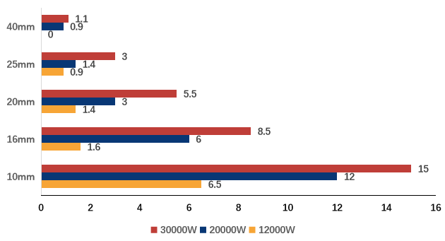 從表中可以看出,30kW輔助空氣切割10mm厚度的碳鋼相較20kW效率提升了25%,效率相較雖有提升,但優(yōu)勢并不非常明顯,而在切割25mm厚度的碳鋼優(yōu)勢明顯,30kW的效率相較20kW (輔助氧氣)提升114.3%。