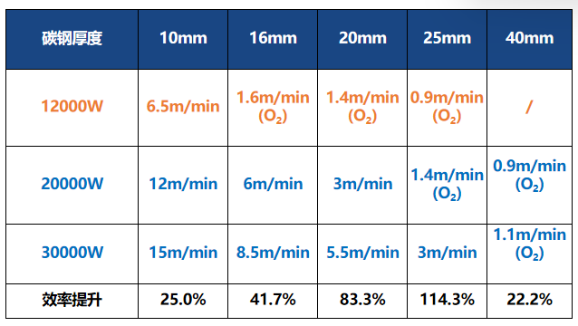 多模組30kW、多模組20kW及多模組12kW切割碳鋼進行工藝實測(表格中未標注輔助氣體的為空氣)