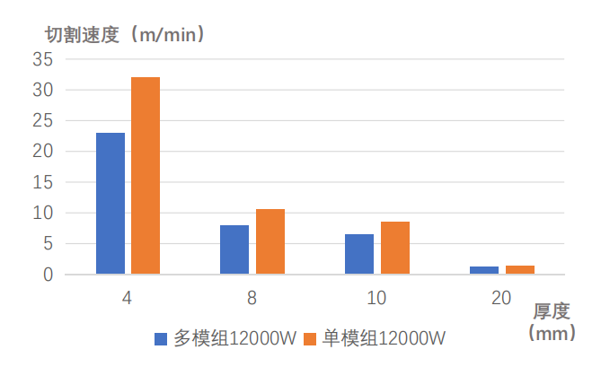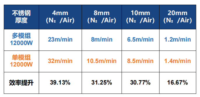 單模組萬瓦激光器的優(yōu)勢在中薄板切割速度,以銳科單模組12000和多模組12000激光器進行對比,在20mm以下不同厚度的不銹鋼輔助氮氣或空氣切割條件下,單模組12000切割效率優(yōu)于多模組12000光纖激光器。