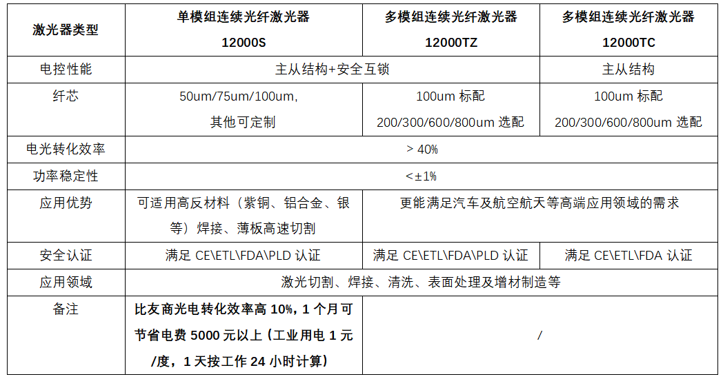 此外,為了滿足不同公司個性化應用需求,同種功率下銳科可提供更多選擇。以12kW為例,銳科生產(chǎn)制造單模組連續(xù)光纖激光器12000S、多模組連續(xù)光纖激光器12000TZ、12000TC等多種同功率的光纖激光器,而且同一類型的激光器還可定制匹配不同的纖芯,可最大程度地滿足客戶的需求。