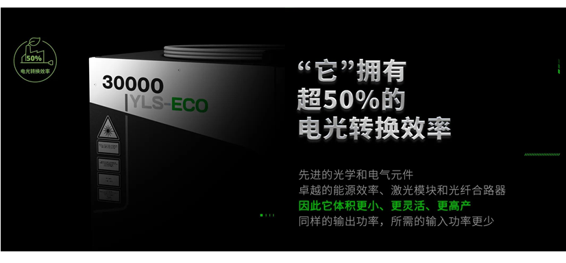 在切割市場激光器功率不斷走高的同時(shí),另一項(xiàng)技術(shù)指標(biāo)的天花板也被IPG再一次自我刷新。早在2014年,IPG便推出了電光轉(zhuǎn)化效率超過40%的激光器產(chǎn)品。2016年,這一數(shù)據(jù)被更新到50%(部分產(chǎn)品,部分環(huán)境下)!2022年,IPG將這一高效節(jié)能技術(shù)應(yīng)用至更全面、更高功率的產(chǎn)品,并在中國市場正式發(fā)布YLS-ECO系列高效節(jié)能光纖激光器,宣告30kW激光器電光效率也超過了50%。IPG在光電轉(zhuǎn)化效率上刷新了行業(yè)新高度,大大降低了長期工作設(shè)備的電費(fèi)成本,同時(shí)也大幅降低了激光設(shè)備的碳排放。