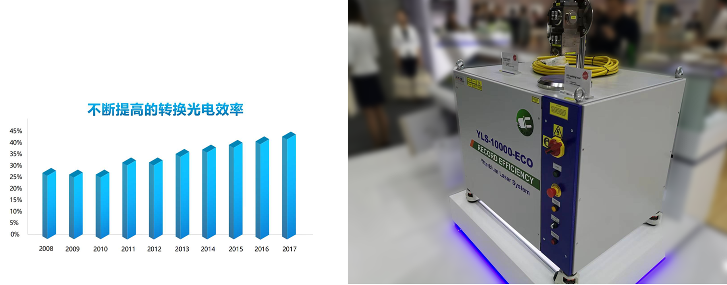 如前文所說,更高功率的工業(yè)應(yīng)用推動(dòng)著更高光電轉(zhuǎn)化效率的追求,IPG從2008年25%的電光轉(zhuǎn)化效率一路提升,目前已將電光效率超過50%的ECO技術(shù)推向30kW并進(jìn)入工業(yè)應(yīng)用。
