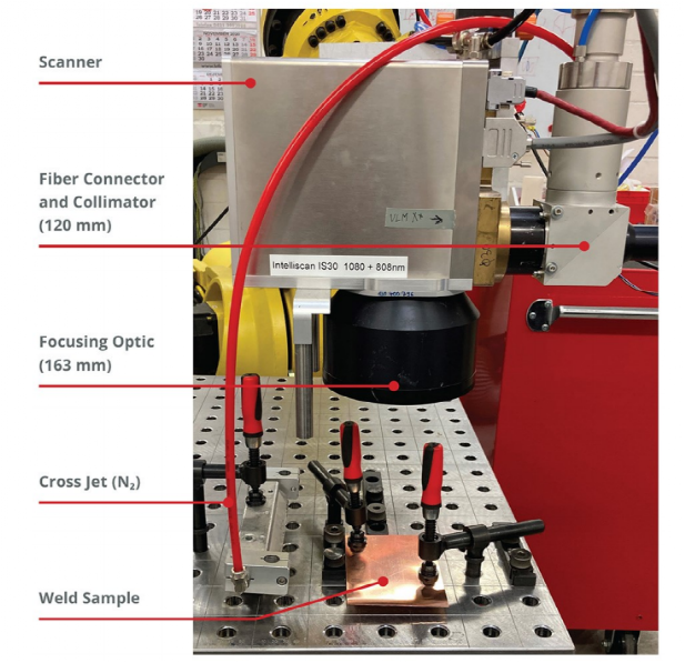 Coherent應(yīng)用工程師使用 ARM 激光進(jìn)行了一系列銅焊接測試,該激光具有直徑為 22 μm 的高亮度中心光束和內(nèi)徑/外徑為 100 μm/170 μm 的環(huán)形光束。使用放大倍率為1.4 的遠(yuǎn)端加工頭聚焦激光,并使用氮?dú)庾鳛楸Wo(hù)氣體和橫向射流。焊接的材料是純銅。所有測試的激光功率均為 4 kW,中心為 1.5 kW,環(huán)形光束為 2.5 kW。照片(圖 2)顯示了實(shí)驗(yàn)裝置。