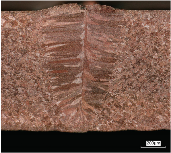 圖 5:輸出功率為 3.5 kW、焊接速度為 300 mm/s 的高亮度紅外 ARM 激光產(chǎn)生的銅焊縫橫截面