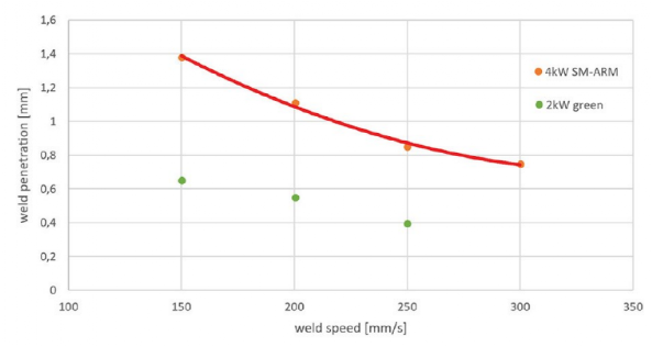 圖 4:與 2 kW 綠光光纖激光相比,4 kW 高亮度 ARM 的焊透深度