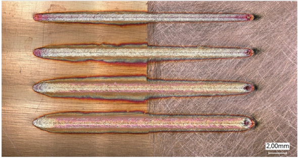 圖 6:光滑和噴砂銅表面上使用 4 kW ARM 激光以不同速度(從上到下 300-150 mm/s)得到的一致焊道
