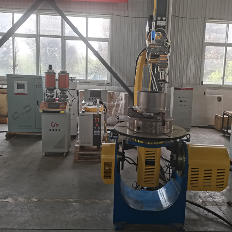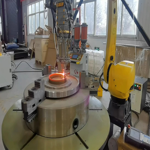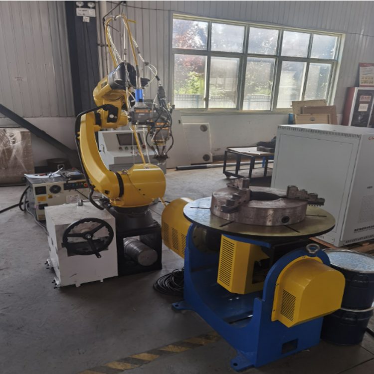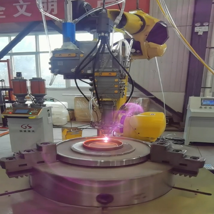 八軸聯(lián)動激光熔覆設(shè)備,是國盛激光自主研發(fā)的以機器人為運動核心,可適應(yīng)各種復雜結(jié)構(gòu),和非標準零件的激光熔覆加工系統(tǒng)。該系統(tǒng)配置靈活多樣,根據(jù)客戶應(yīng)用場景可配置不同規(guī)格的機器人,同時選配變位機、轉(zhuǎn)臺、滑臺以適應(yīng)不同加工類型工件的激光熔覆加工及表面處理。設(shè)備主要由前端執(zhí)行機構(gòu)和后端設(shè)備組成,前端執(zhí)行機構(gòu)包括機械臂、變位機、電氣控制系統(tǒng)、激光熔覆頭、熔覆噴嘴組成;后端設(shè)備包括熔覆專用激光器、熔覆專用水冷機、穩(wěn)壓電源、送粉器等。